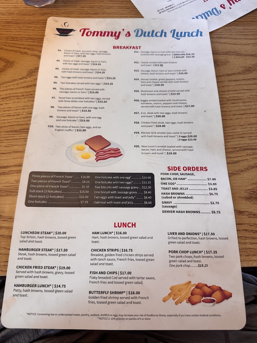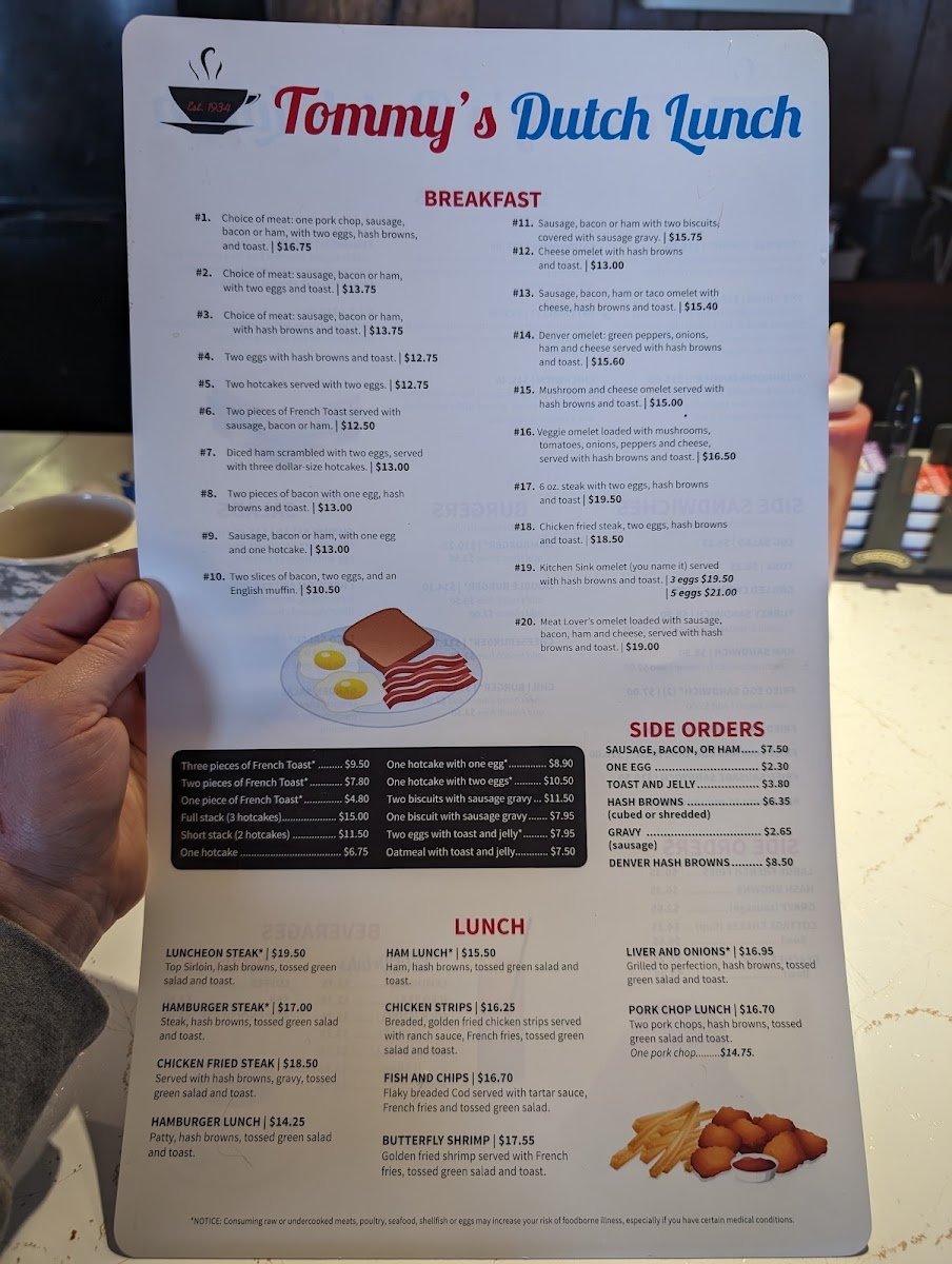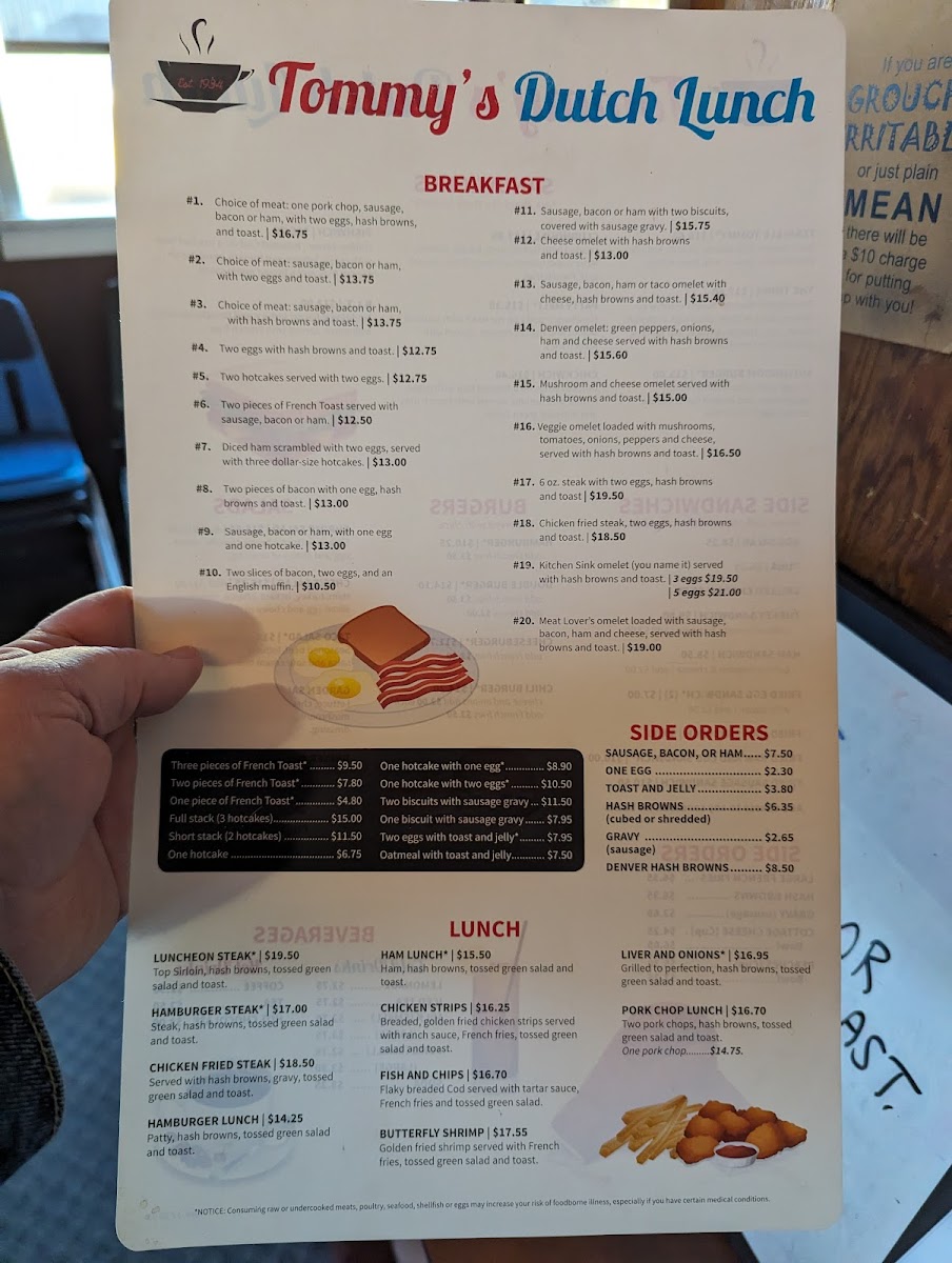 Tommy's Dutch Lunch offers a straightforward, comforting menu that reflects its classic American diner roots. You’ll find a selection of hearty breakfast and lunch dishes designed for any time of day, whether it’s an early morning start or a casual midday meal. The menu features well-loved staples like chicken fried steak and the Kitchen Sink Omelet, alongside simple yet satisfying options such as biscuits and gravy or a mushroom burger.